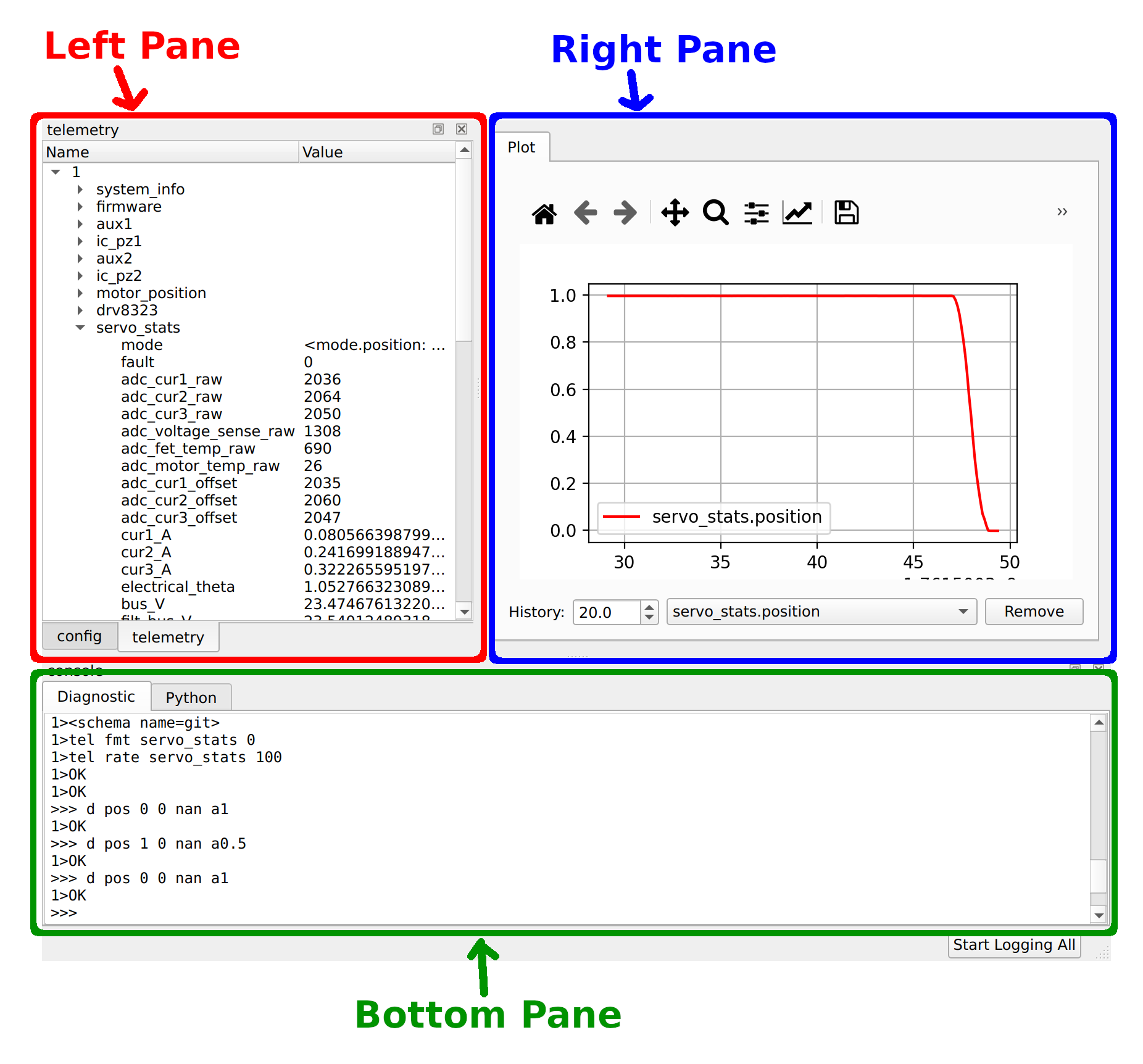 The right pane displays real-time plots of telemetry items. You can populate it with plots by right-clicking on telemetry items in the telemetry tab (left pane, right tab).